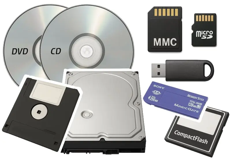 CD, DVD, MMC, SD-Karte, USB-Stick, 3,5" Diskette, Festplatte, CompactFlash, Sony Memory-Stick